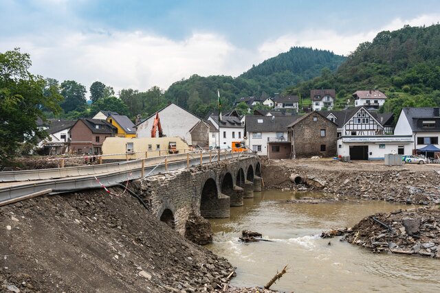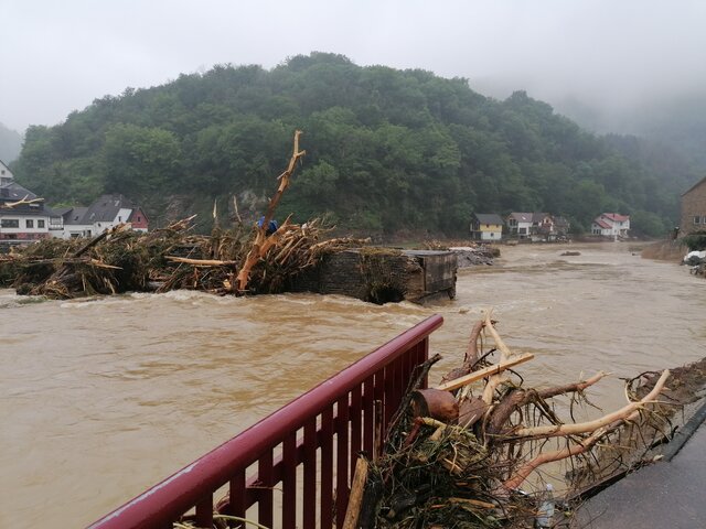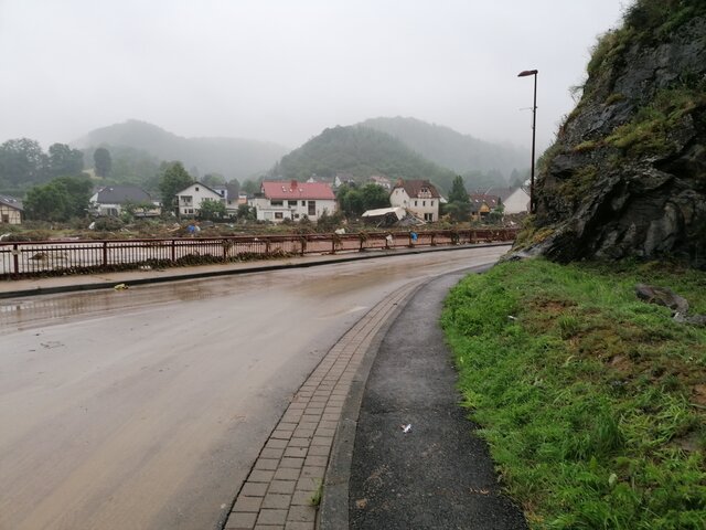 Die teilweise beschädigte Brücke wurde in kürzester Zeit dank des unermüdlichen Einsatzes der Firma Hagedorn wieder befahrbar gemacht, sodass die Ahr wieder mit Fahrzeugen überquert und Schutt sowie Müll abtransportiert werden konnten. Die Baggerfahrer arbeiteten fast rund um die Uhr und stiegen noch nicht mal zum Essen ab.
