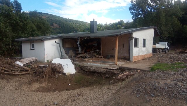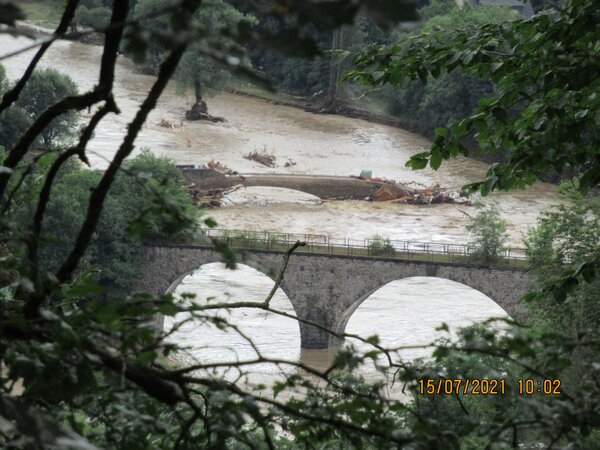 Probleme gab es erst am unteren Ende der Bahnhofstraße, wo der Adenauer Bach die Hauptstraße L 73 unterquert. Totholz und anderes Treibgut verklausten eine Brücke. Als Konsequenz folgte ein Rückstau, der den Keller des normalerweise 30 Meter vom Adenauer Bach entfernt stehenden Gasthauses Strohe komplett und das Erdgeschoss immerhin noch bis zu 40 Zentimetern flutete.