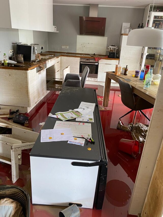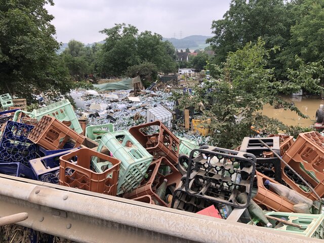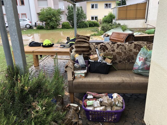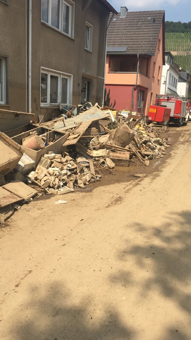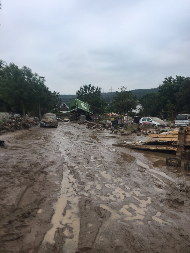 Zum Glück herrschte an den Tagen nach der Katastrophe heißes Sommerwetter, was die Arbeiten erleichterte, aber die Versorgung schwierig machte. Es gab weder Strom noch fließendes Wasser und auch Telefonieren war kaum möglich. Allerdings erreichten uns über die A 61 ziemlich schnell spontane Hilfstransporte von Privatleuten und Firmen, die sich nach den ersten Medienberichten einfach auf den Weg gemacht hatten. Auf dem Marktplatz hatten sich einige nicht betroffene Bewohner positioniert und versuchten Hilfeersuchen und Angebote zu koordinieren. Wasser, Lebensmittel und Hygieneartikel wurden an der Kirche für alle frei zugänglich abgeladen. Helfer kamen mit Speisen, Arbeitsmaterial und guten Kontakten für weitere Unterstützungen.