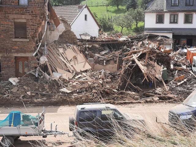 Unser Haus wurde vom THW wegen Einsturzgefahr abgerissen. Da kam eine hochschwangere dünne Frau zu mir, eine Psychologin aus Bonn. Die Altenahrer Feuerwehr hatte sie zu mir geschickt. Ich habe ihr lange erzählt, während unser Haus abgerissen wurde. Der Baggerführer fand den Umschlag mit dem Bargeld, das Gaby in der Flutnacht nicht mehr retten konnte, und gab es ihr.