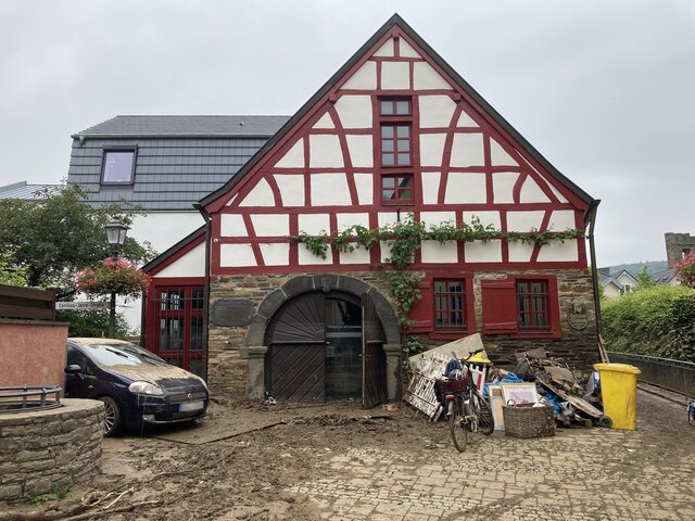 In der Ramersbacher Straße parkten Autos auf der Höhe der Alten Ziegelei an nie zuvor gesehener Stelle, das war ungewöhnlich. Der Nachbar trat aus dem Haus, bestätigte den Stromausfall und wusste, dass die Ahr Hochwasser führte. „Lass uns mal Richtung Stadt gehen und schauen“, schlug er vor. Laufen kam wegen meiner Hüftprobleme für mich nicht in Frage, also nahmen wir unsere Fahrräder.