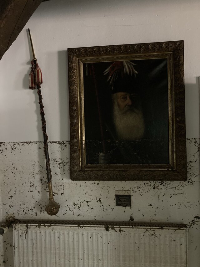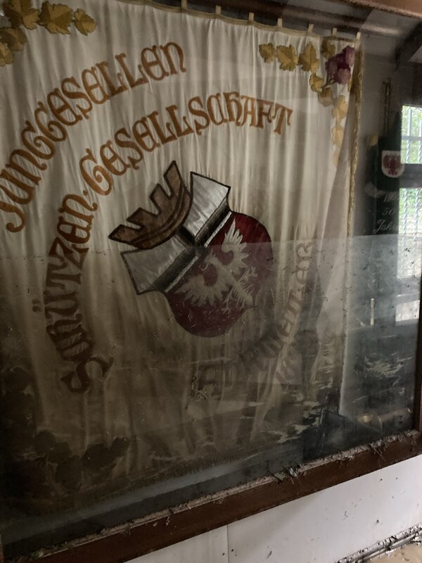 Für die alten Fahnen der Gesellschaften hatten sich im Laufe der Woche rettende Restauratoren gefunden, die diese in der Flutumgebung bargen und erstversorgten. Bei der Entnahme der Fahnen aus den Fahnenschränken stellten wir fest, dass eine Fahne fehlte. Nach einigen Telefonaten war klar, dass sie sich beim Zugführer der Schützen befand und dass die Flut die Fahne in dessen Keller erwischt hatte. Wir fuhren mit dem Fahrrad zum Haus des Zugführers. Als ich auf dem Hof ankam, wollte man gerade anfangen, die Fahne zu kärchern, mit dem Hochdruckreiniger den Dreck zu entfernen. Das konnte ich gerade noch verhindern. Mit der zusammengerollten Fahne auf der Schulter fuhr ich zurück zum Schützenmuseum und übergab sie dort den Restauratoren.