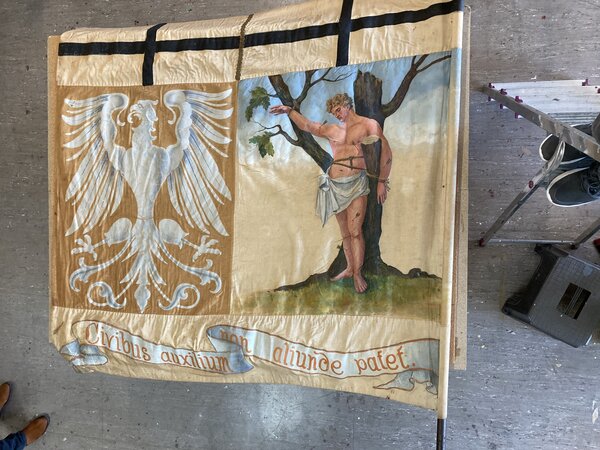 Nach den Einschränkungen durch Corona und die Flut hatten sich die Schützen und die Stadt auf das große Schützenfest 2022 gefreut. Endlich wollte man zu Fronleichnam wieder gemeinsam aufziehen. Dazu brauchten wir die Fahnen zurück. Mit einer Kraftanstrengung ist es den Restauratoren gelungen, die Fahnen rechtzeitig zu restaurieren und an die Schützengesellschaften zurückzugeben.